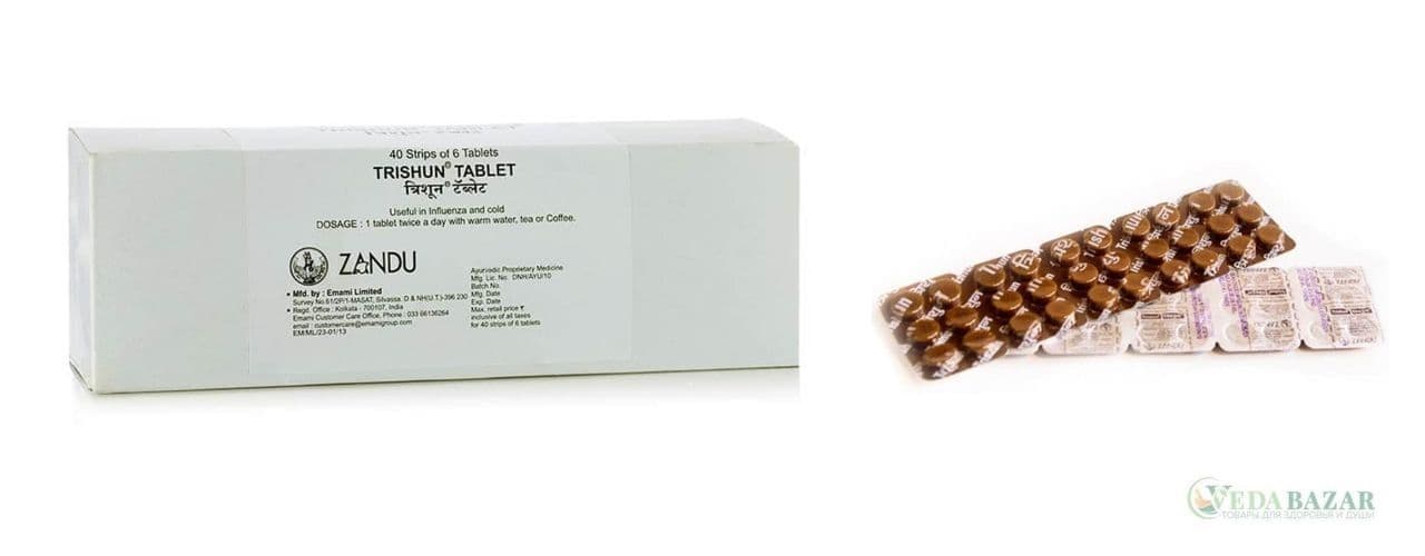 В состав Тришун входят такие прекрасные антипростудные препараты как: Сударшан чурна, который содержит свыше 50 ингредиентов;Трибхуван Кирти раса.