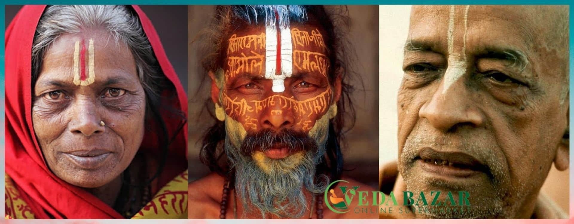 Вайшнавы используют глину из священных рек (таких как Ямуна) или святых мест паломничества (таких как Вриндаван), которую иногда смешивают с сандаловой пастой. Они накладывают тилаку в форме двух вертикальных линий, соединяющихся вместе между бровями, такая форма символизирует стопы Вишну.